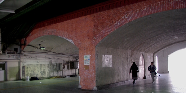 JR有楽町駅の有楽町中央口架道橋(中央の煉瓦造りのアーチ2個分)は、有楽町東口再開発(ガードの反対側、画像右端・丸井が建っているところ)に伴い車道が潰され歩道になりました。
