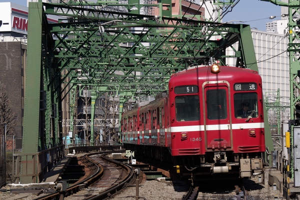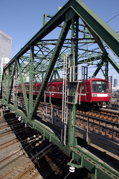 京急品川-北品川間にある八ツ山跨線線路橋(通称八ツ山鉄橋、1933年)です。斜めに渡されたワーレントラス橋で、S字カーブの中間点にあるため幅員も広くなっています。