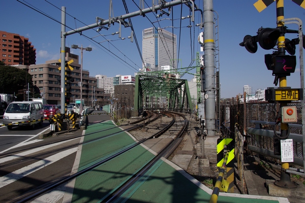 八ツ山橋(自動車・歩行者橋)と平行に渡りますが、渡り終えたところでいきなり八ツ山橋とクロスします。列車本数が多い上に急カーブのため超鈍足なので、この品川第一踏切は朝夕はほとんど開かずの踏切になります。