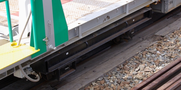 東武のレール運搬車 M-RT 05 です。私鉄の保線機械系のレール運搬車としては少数派のボギー車で、クレーンは4基ついています。