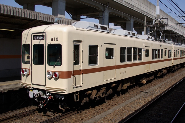 モハ810。妙にスッキリした顔に見えるのは貫通路が埋め込まれているためです。