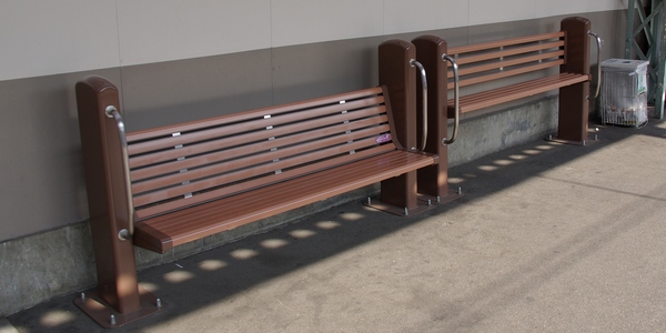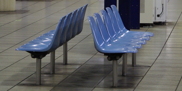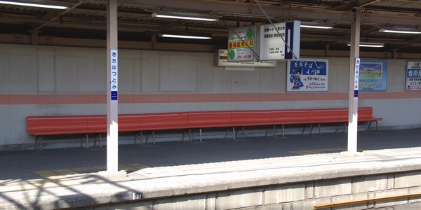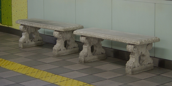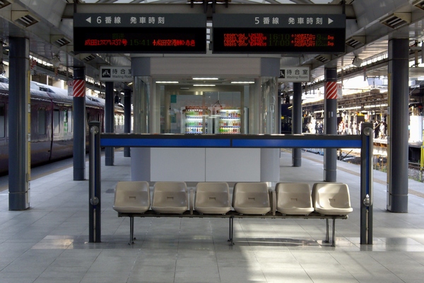 レール方向と垂直に配置されたイス。ホームが広く、乗降客も少ない特急ホームのみに許される配置。