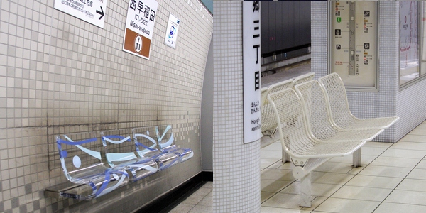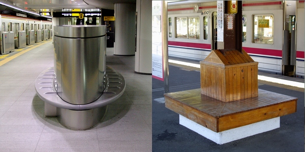 (左)芸術的なイスその2。(右)全周形の木製ベンチ。緊急ボタンとの干渉が問題か。