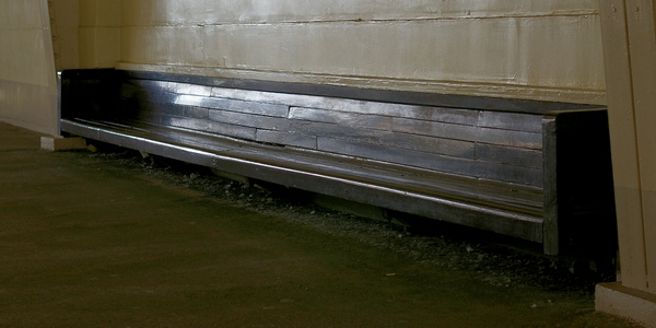 時代を感じる木製ロングベンチ。雨風があたらず日も差さないので痛みが少ない。こういう長いイスを見ると寝ころぶ奴が必ずいます。