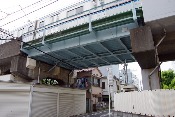 京急・仲木戸駅にある、国鉄貨物線跨線路橋です。かつてはここに東海道本線貨物支線が通っていましたが、廃止されて道路になっています。