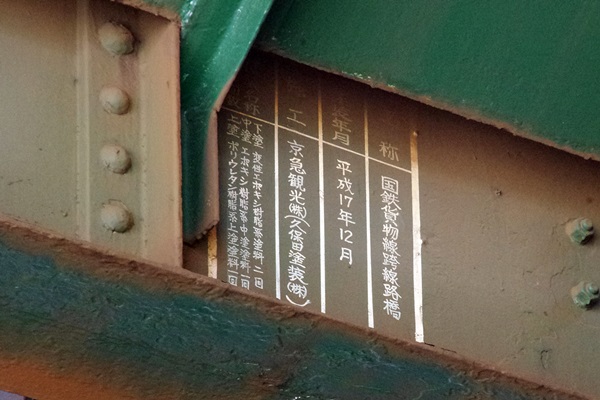 今や、駅の一部となってしまった架道橋ですが、塗装表記だけに「国鉄貨物線跨線路橋」という名称が残っています。