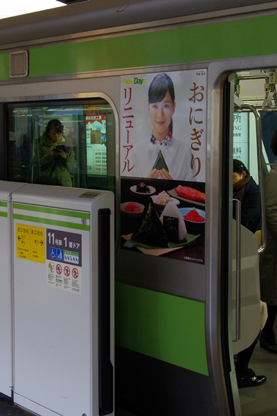 JR東日本系列のコンビニ NewDays のラッピング広告「おにぎりリニューアル」です。528編成です。