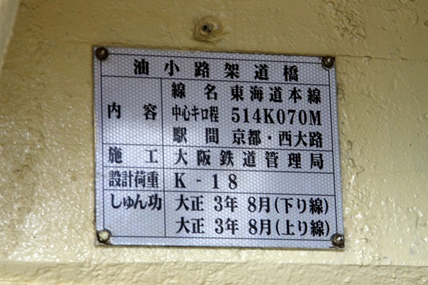 東海道本線・京都-西大路間にある油小路架道橋(大正3年8月)です。制限高1.8mの低い橋で、側面はレンガですが、天井も含めてクリーム色で全面塗装されています。