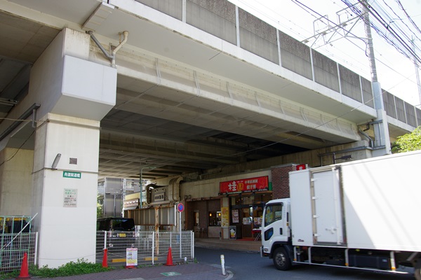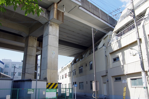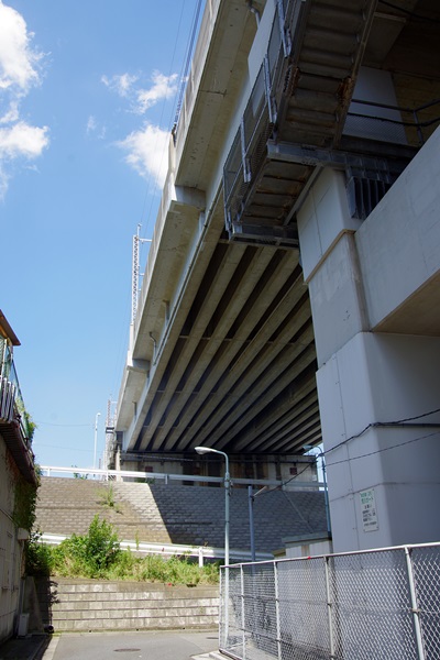 道路も跨いでいるので、「架道橋」ではあるのですが、国鉄(JR)とは無関係の民間の建物(第一硝子の本社・工場)を跨いでいるのであります。しかもすれすれのところを。ということで、架道橋ではなく高架橋。ちなみに、下にJR関連の施設がある場合は「架道橋」のままが多いです。