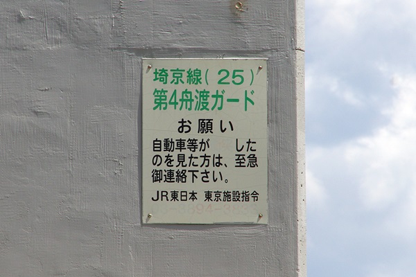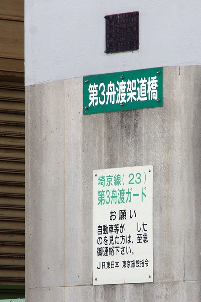 埼京線(25)第4舟渡ガード。え? 名前が同じなのに番号が(24)から(25)に大きくなっていますが。番号が違うと言うことは、名前は違うはずなので、(25)の方の本名は「第4舟渡架道橋」なんでしょうか。そうならば、通称名は「第4舟渡ガード」でいっしょになります。しかし、そんなプレート気づかなかったなあ。