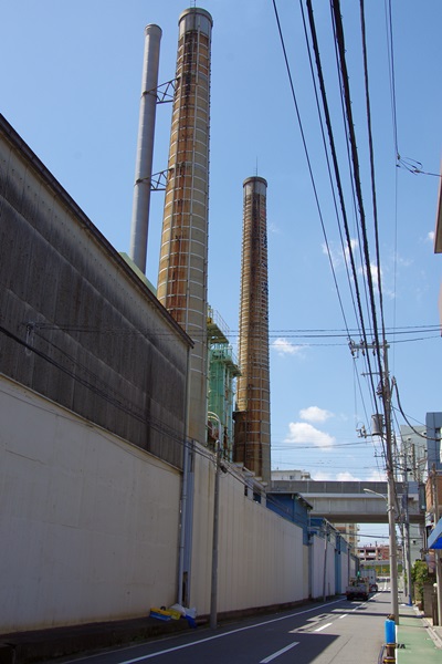 裏側。第一硝子さんの煙突の横から出て来ます(画像右奥)。で、これが。