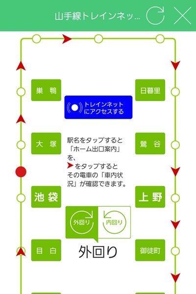 山手線トレインネットでは、同編成は赤丸で表示されます(画像では池袋-大塚間を走行中)。ちなみに赤矢印は通常のE231系、E235系はE235系前面イラストで表示されます。