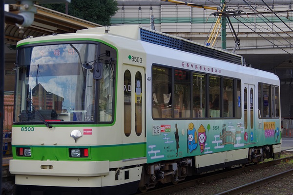 都電8503 荒川区「俳句のまち あらかわ」ラッピング広告車です。松尾芭蕉が「⾏春や⿃啼⿂の⽬は泪」と詠んで奥の細道に旅立ったということで、起点となった荒川区の俳句文化振興事業です。