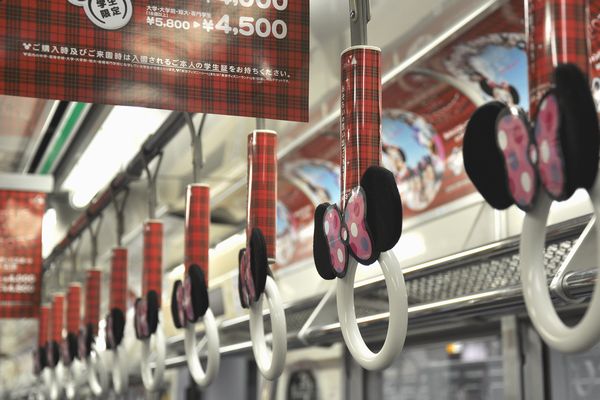 しかし、車内はディズニーリゾート「キャンパスデーパスポート」の全面広告となっていて、つり革にミニーちゃんのカチューシャが付いています。コピーは「おそろいの思い出つくろう!」。
