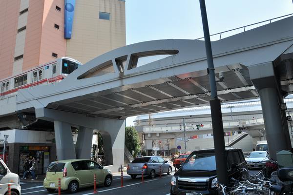 下から見たところ。鉄骨がアーチ形になっています。後楽園駅からの画像はここ。