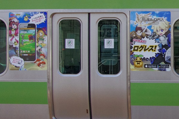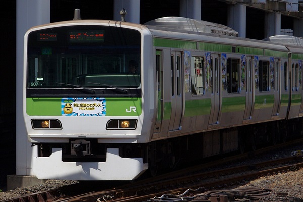 山手線E231系507編成、スマホ向けゲーム「ログレス」ラッピング広告車。ヘッドマーク付きです。