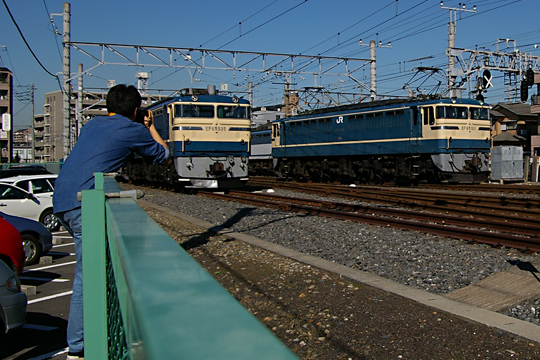 EF65 501 と EF65 535 と それを撮す人。この人のTシャツにクリーム色のラインでも入っていれば…。