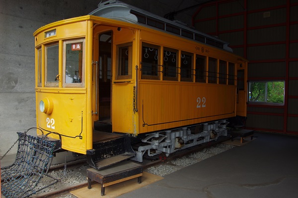 交通資料館(札幌)で保存されている二軸路面電車 22 です。明治34年製。名古屋で活躍した後、大正7年に札幌電気軌道に売却され、さらに昭和2年に札幌市に譲渡され昭和11年に廃車になっています。